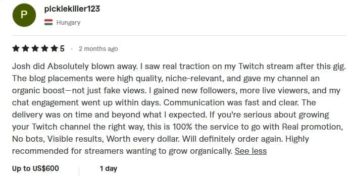 Josh did absolutely blown away. I saw real traction on my Twitch stream after this gig. The blog placements were high quality, niche-relevant, and gave my channel an organic boost not just fake views. I gained new followers, more live viewers, and my chat engagement went up within days. Communication was fast and clear. The delivery was on time and beyond what I expected. If you're serious about growing your Twitch channel the right way, this is 100% the service to go with Real promotion, No bots, Visible results, Worth every dollar. Will definitely order again. Highly recommended for streamers wanting to grow organically.